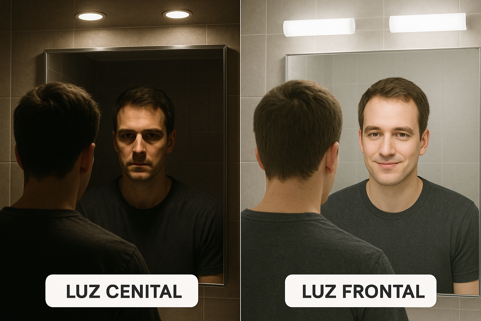 Para evitar sombras marcadas en el rostro, la mejor opción es utilizar luz opal o difusa, que suaviza los rasgos y ofrece una iluminación más uniforme. Este tipo de luz no deslumbra, es más agradable a la vista y permite ver con mayor precisión los detalles, algo esencial en las tareas de cuidado personal.