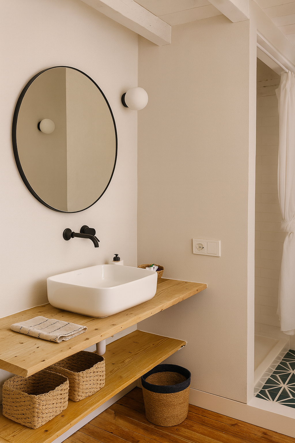 Cuando se trata de un baño secundario o un aseo de cortesía, la iluminación puede tener un enfoque más decorativo y ambiental. En estos casos, no es necesario priorizar la funcionalidad, sino la atmósfera. Se pueden utilizar apliques con diseños más expresivos o incluso luminarias colgantes colocadas en un lateral o rincón, generando un ambiente cálido y acogedor que aporte personalidad al espacio.
