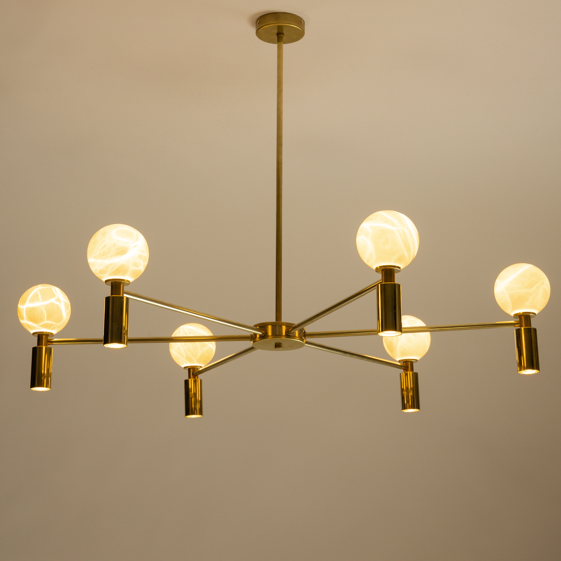 Luminaria colgante de forma circular con 6 brazos. Medidas: Ancho (x): 1000 mm. Alto (h): 800 mm. Profundidad (z):1000 mm.