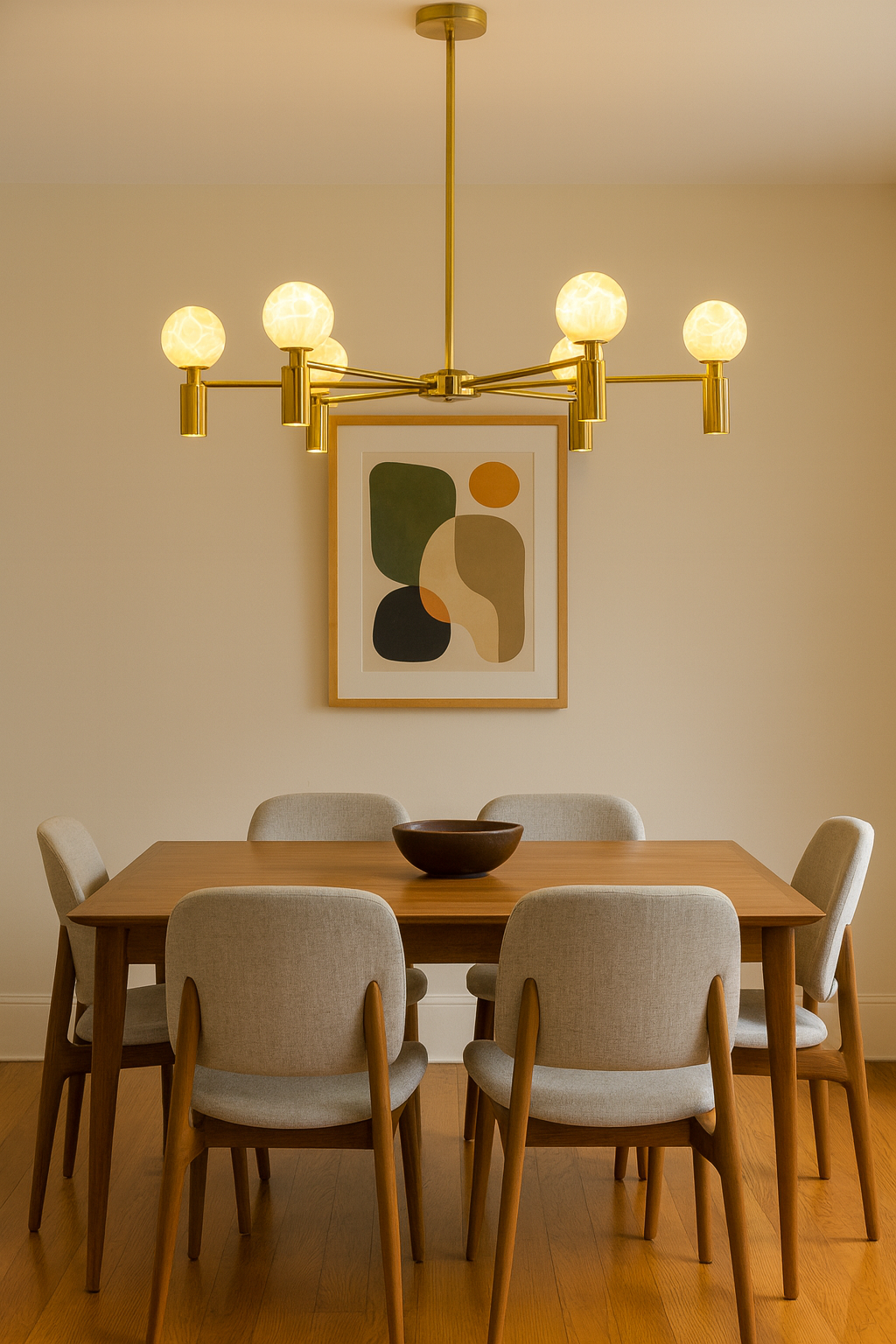 Luminaria colgante de forma circular con 6 brazos. Medidas: Ancho (x): 1000 mm. Alto (h): 800 mm. Profundidad (z):1000 mm.
