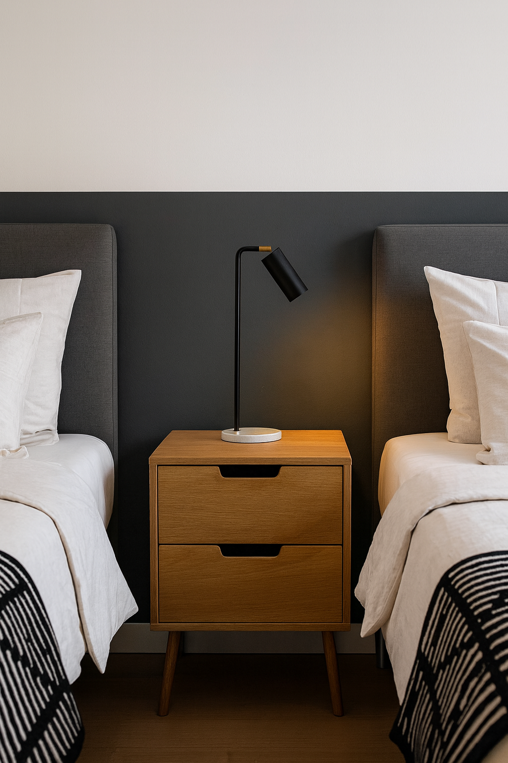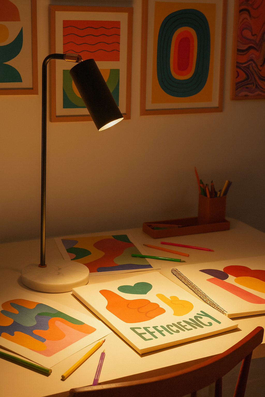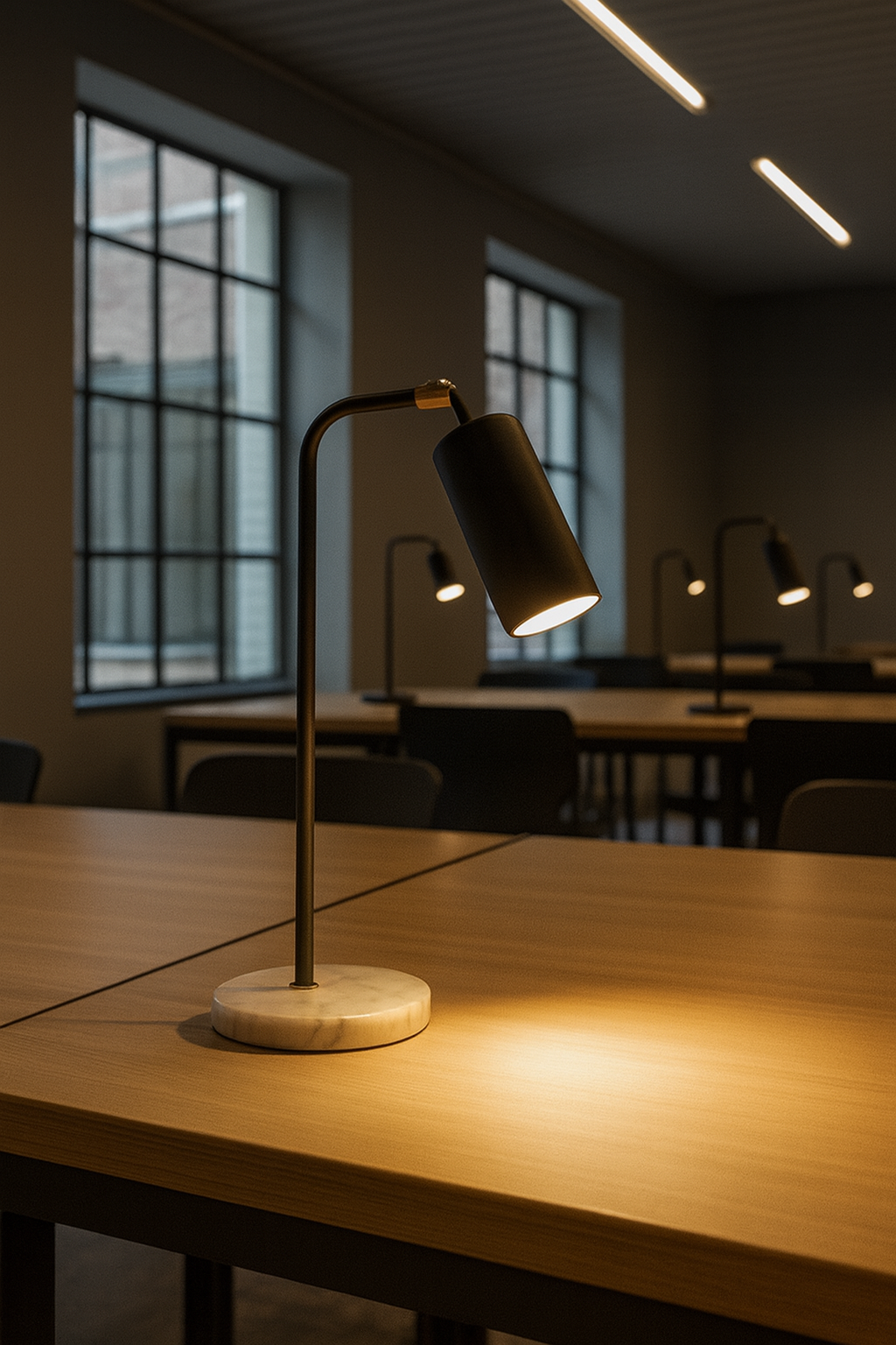 Lámpara de mesa artesanal con estructura de acero negro y detalles en latón sobre base de mármol blanco. Su diseño minimalista y foco orientable ofrecen una luz cálida y precisa, ideal para espacios de trabajo o lectura con estilo contemporáneo.