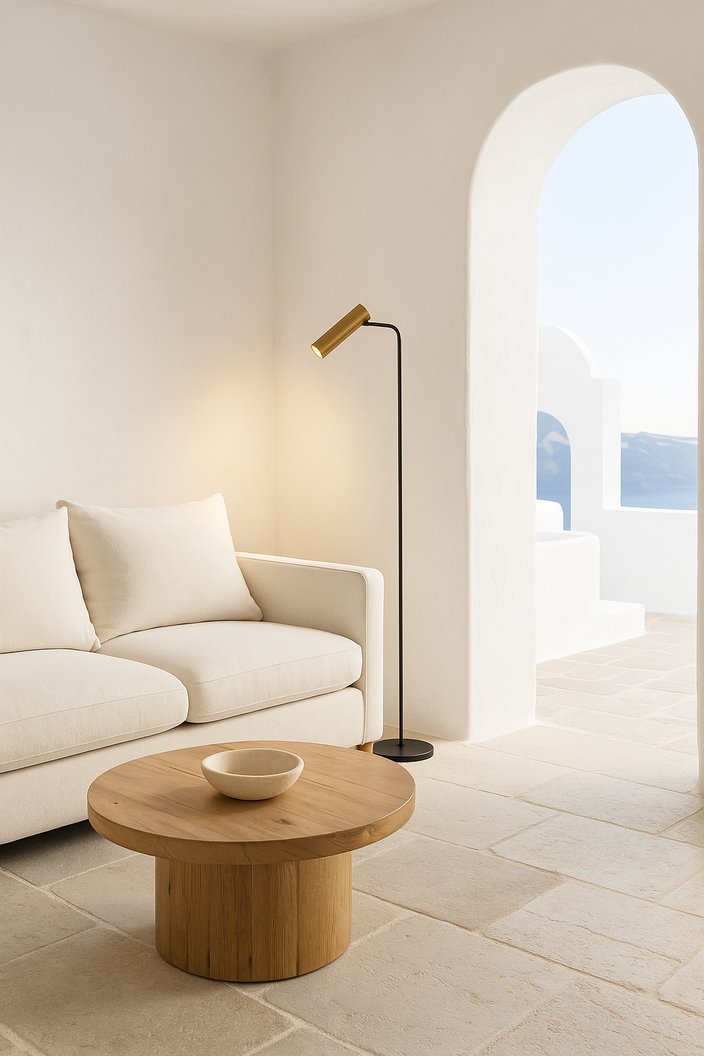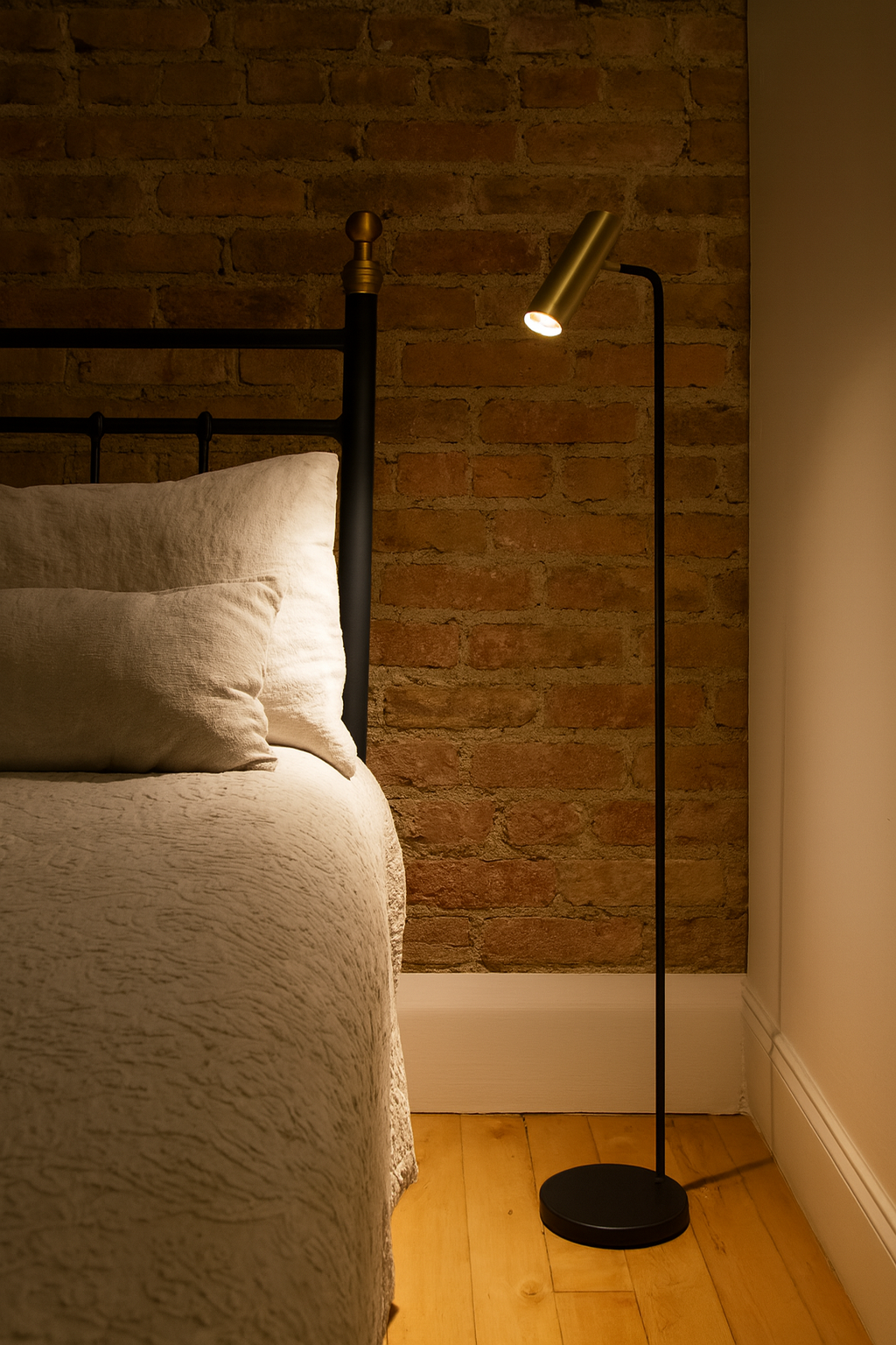 Lámpara de pie con estructura negra y foco orientable en latón. Su diseño funcional y elegante ofrece una iluminación precisa y cálida, ideal para rincones de lectura o ambientes contemporáneos con un toque sofisticado.