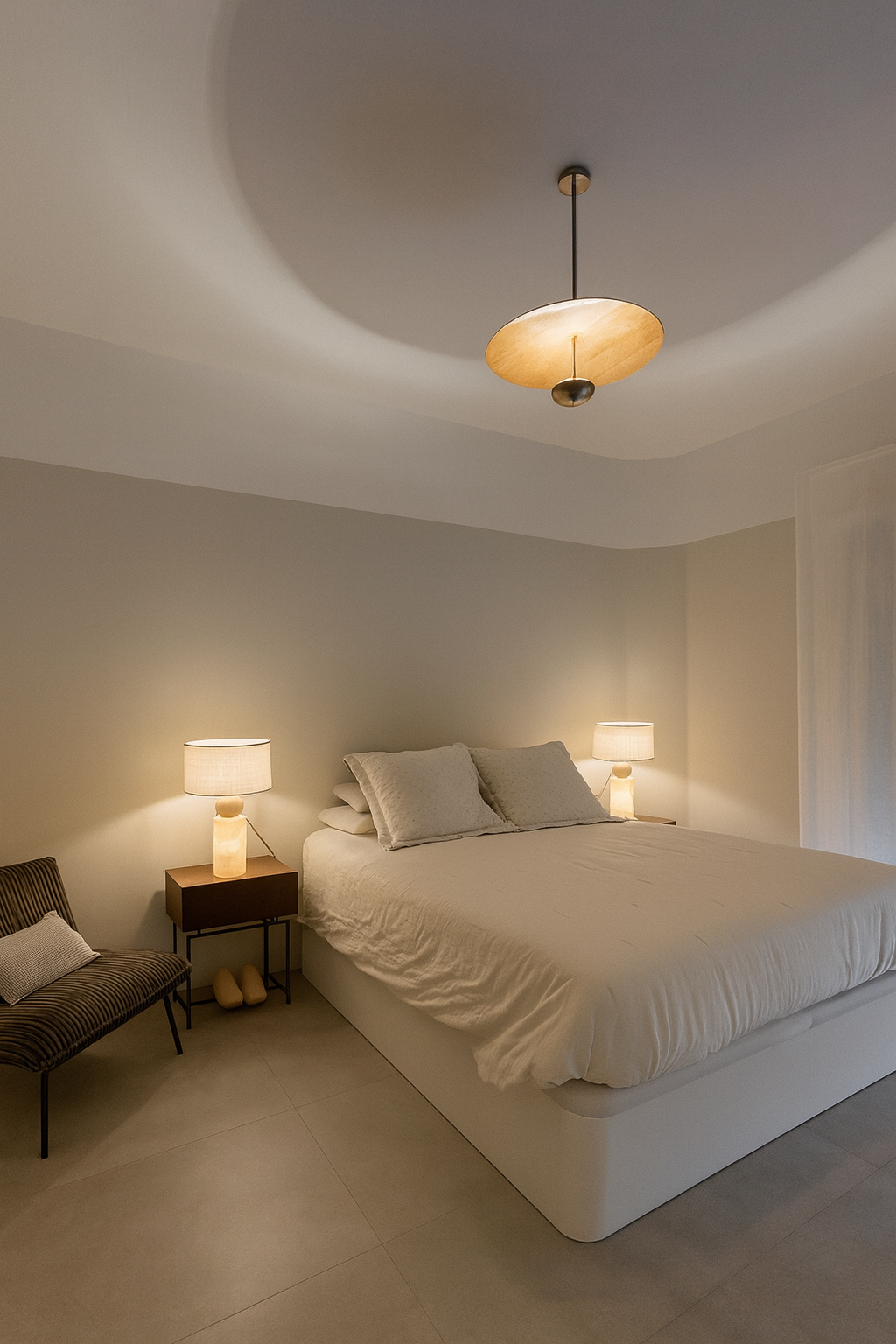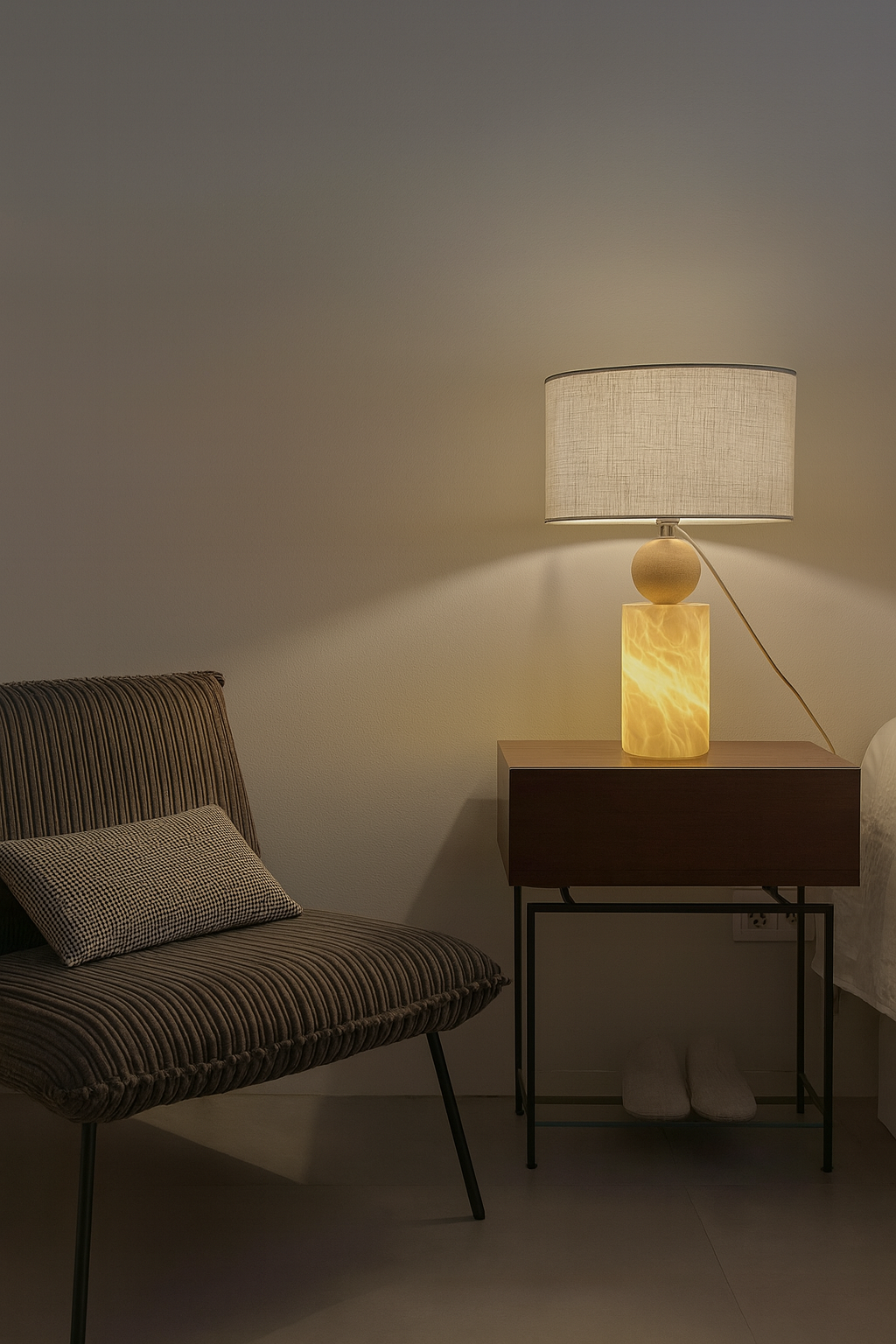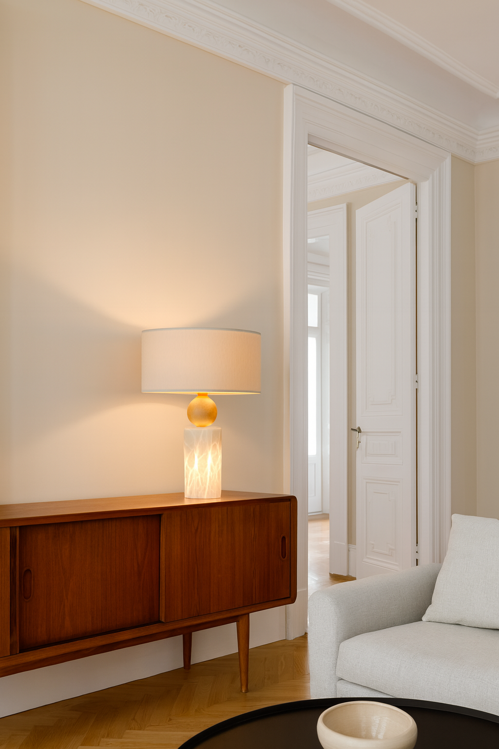Lámpara de mesa con base cilíndrica de alabastro retroiluminado y detalle esférico en madera natural. Su pantalla textil difunde una luz cálida que resalta la elegancia y la textura única de la piedra.
