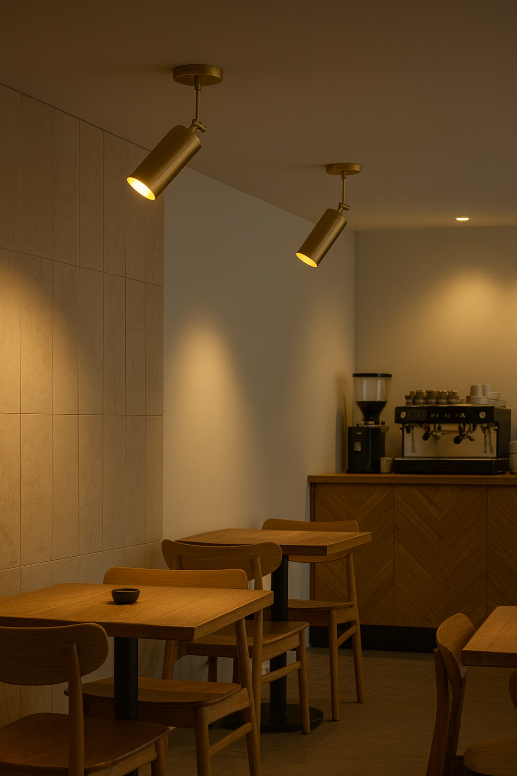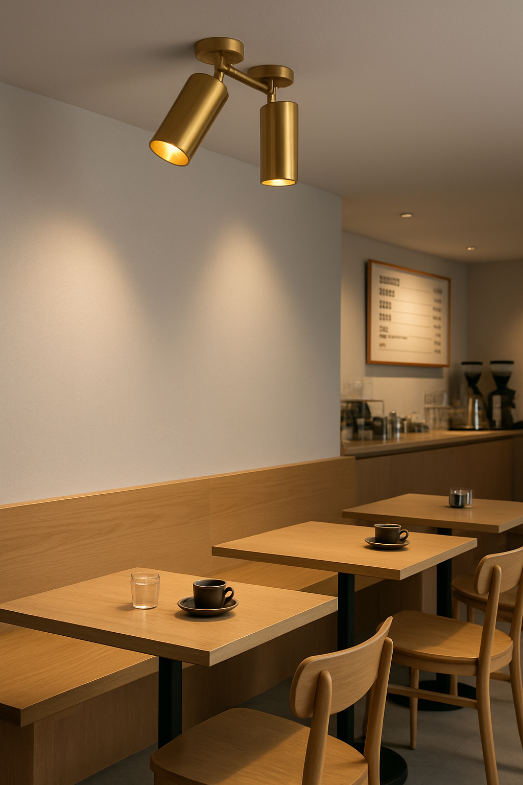 Luminaria de techo formada por dos proyectores tubulares que ofrecen iluminación focalizada en varias direcciones, está fabricado en latón.