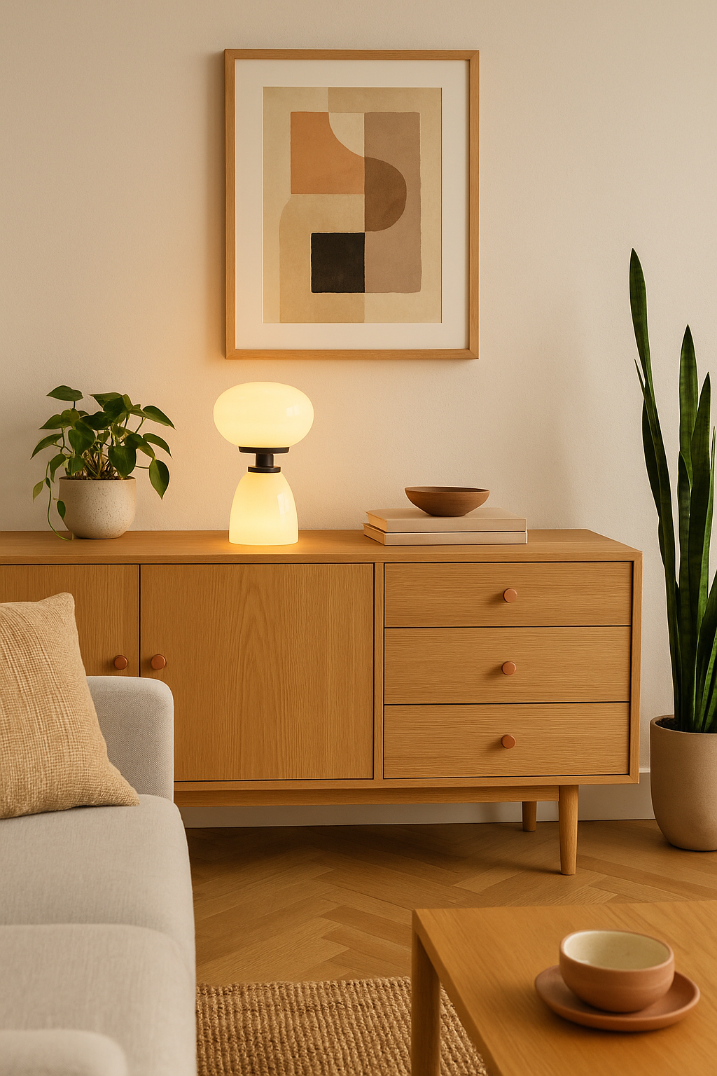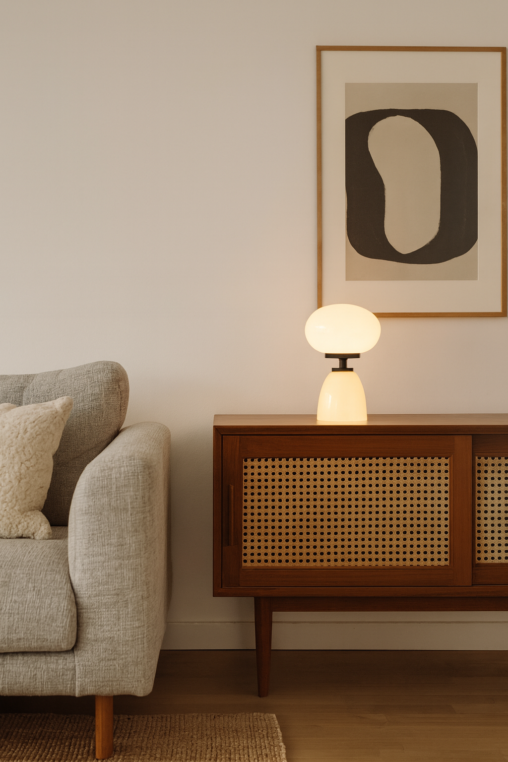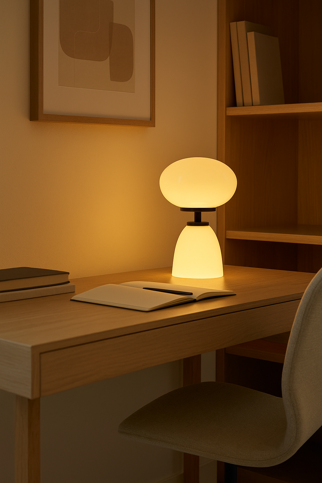 Lamparita de mesa de diseño contemporáneo con base y pantalla de vidrio opal y detalles en latón cepillado. Proporciona una luz cálida y envolvente ideal para crear ambientes acogedores.