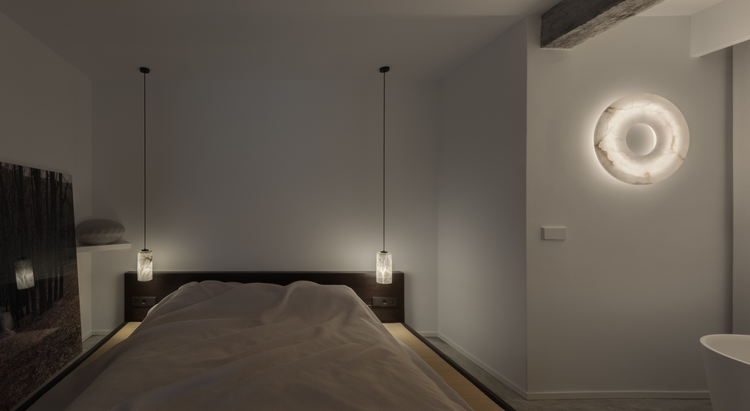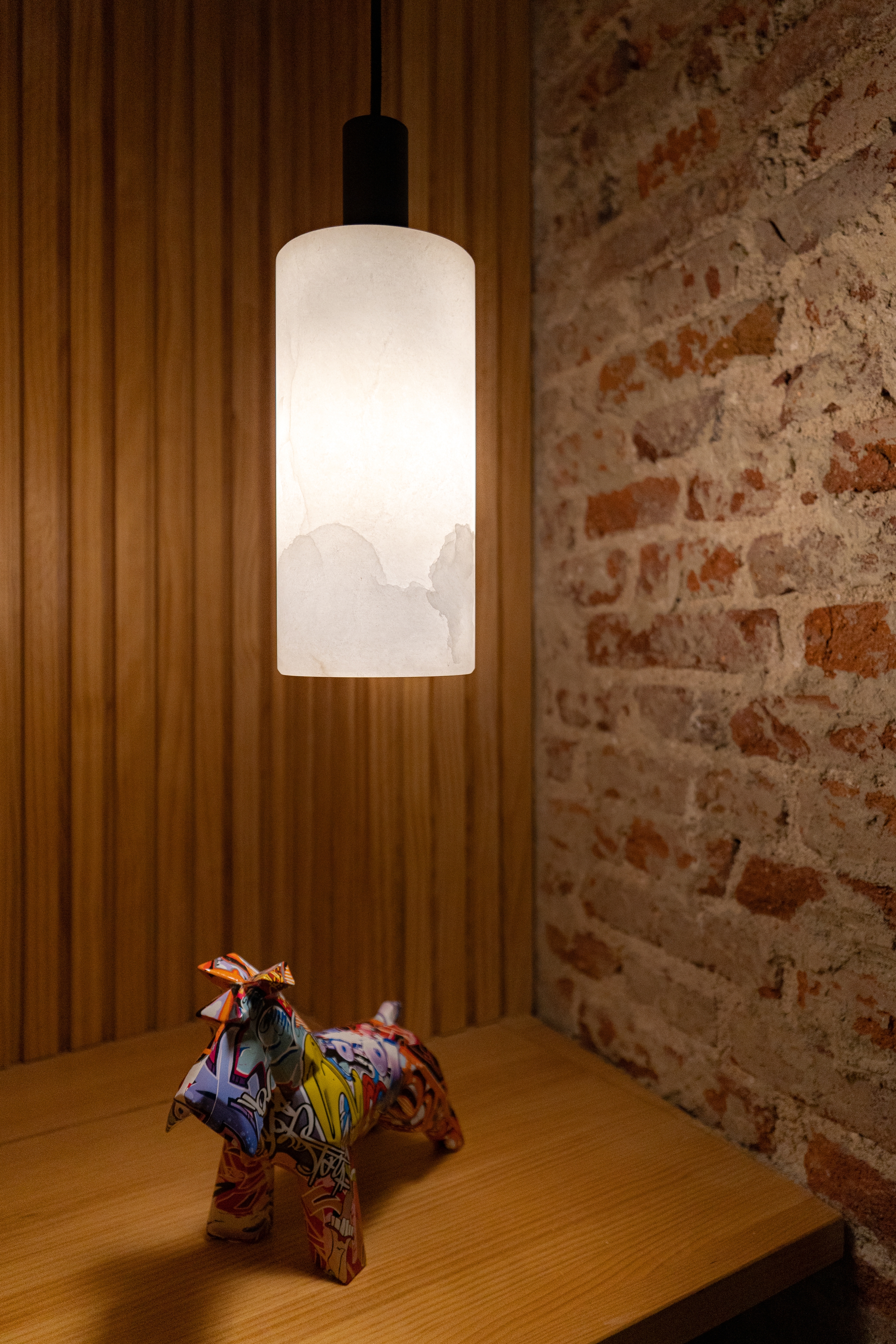Lámpara colgante de alabastro natural con acabado en latón bruto. Su diseño minimalista y luz cálida crean una atmósfera elegante y acogedora, ideal para iluminar comedores, barras o espacios de estilo contemporáneo. Fabricada artesanalmente por D-LUZ.